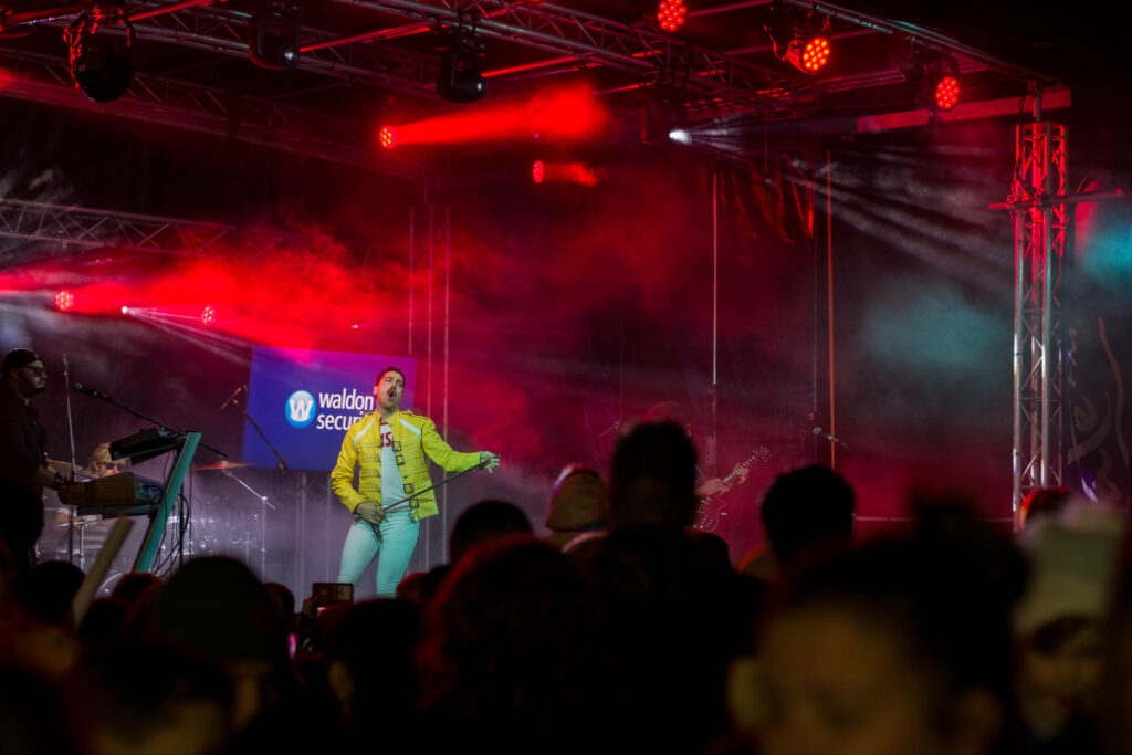 2022 was the first year we partnered with the event providing sound, lighting, video, crew and an 8m x 6m trailer stage with the help of our friends at Trailer Swift. On audio we had two systems, the main FOH PA, a ground stacked point source system, catering to the audience area directly in front of the stage. For the second system we deployed 2x delay towers of 8 speaker hangs of our compact line array, Vela, on 2 of our 7m PA towers to ensure that all 14,000 people could feel part of the event. Providing a much needed improvement on intelligibility compared to years past.